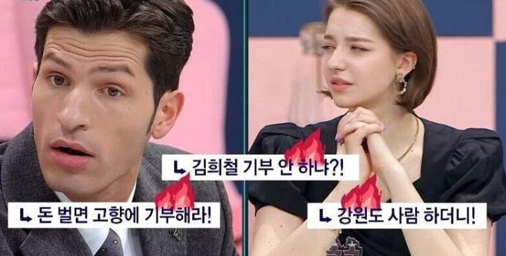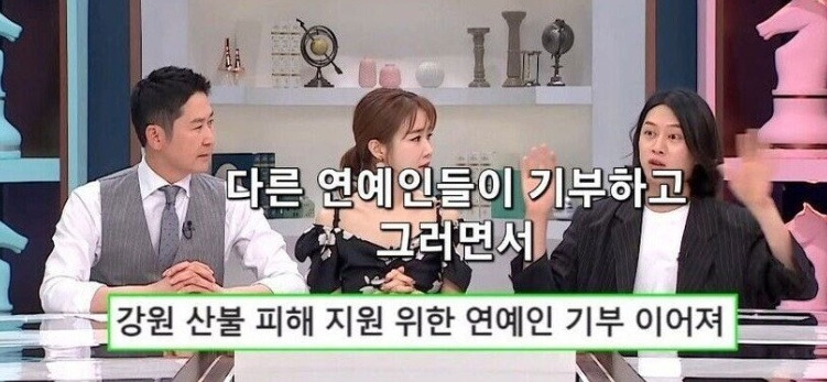 며칠 후, 산불이 큰 이슈가 되면서 연예인들의 기부 소식이 쏟아져 나왔고, 자연스럽게 김희철 씨에게도 관심이 쏠리기 시작했습니다. 이때 SM엔터테인먼트에서 김희철 씨에게 기부 사실을 공개하자고 연락이 왔다고 하는데요. 그 이유는 다른 연예인들의 기부가 알려지면서, 강원도 출신인 김희철 씨는 왜 기부를 하지 않느냐는 악플과 마녀사냥이 온라인 커뮤니티에서 횡행했기 때문입니다.