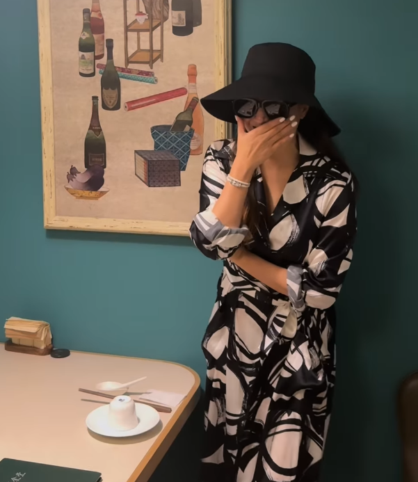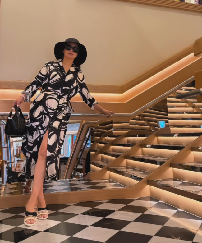 블랙 컬러의 버킷햇과 커다란 선글라스를 착용해 시크한 분위기를 더했고, 블랙 앤 화이트 컬러의 슬릿 롱원피스를 선택했어요. 이 원피스는 허리를 잡아주는 실루엣으로 바디 라인을 자연스럽게 강조했으며, 패턴으로 고급스러움을 더했죠. 특히 앞트임이 있는 슬릿 디테일 덕분에 걸을 때마다 실루엣이 자연스럽게 드러나 우아하면서도 관능적인 분위기를 동시에 자아냈어요.