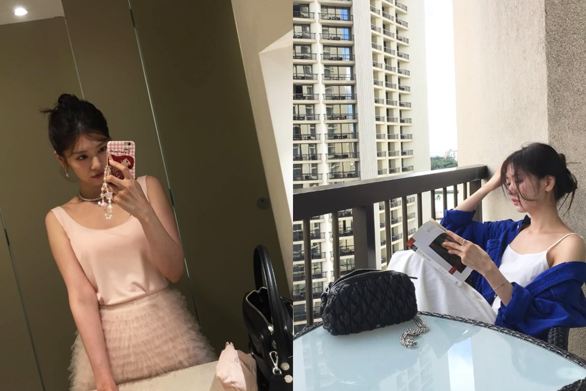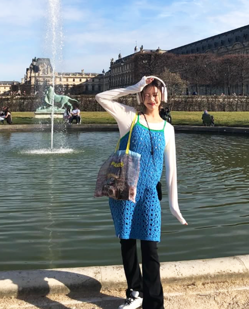 정소민은 얇은 아이보리 톤의 이너 티셔츠 위에 블루 컬러의 크로셰 스타일 슬립 원피스를 매치해 산뜻한 분위기를 연출했다.