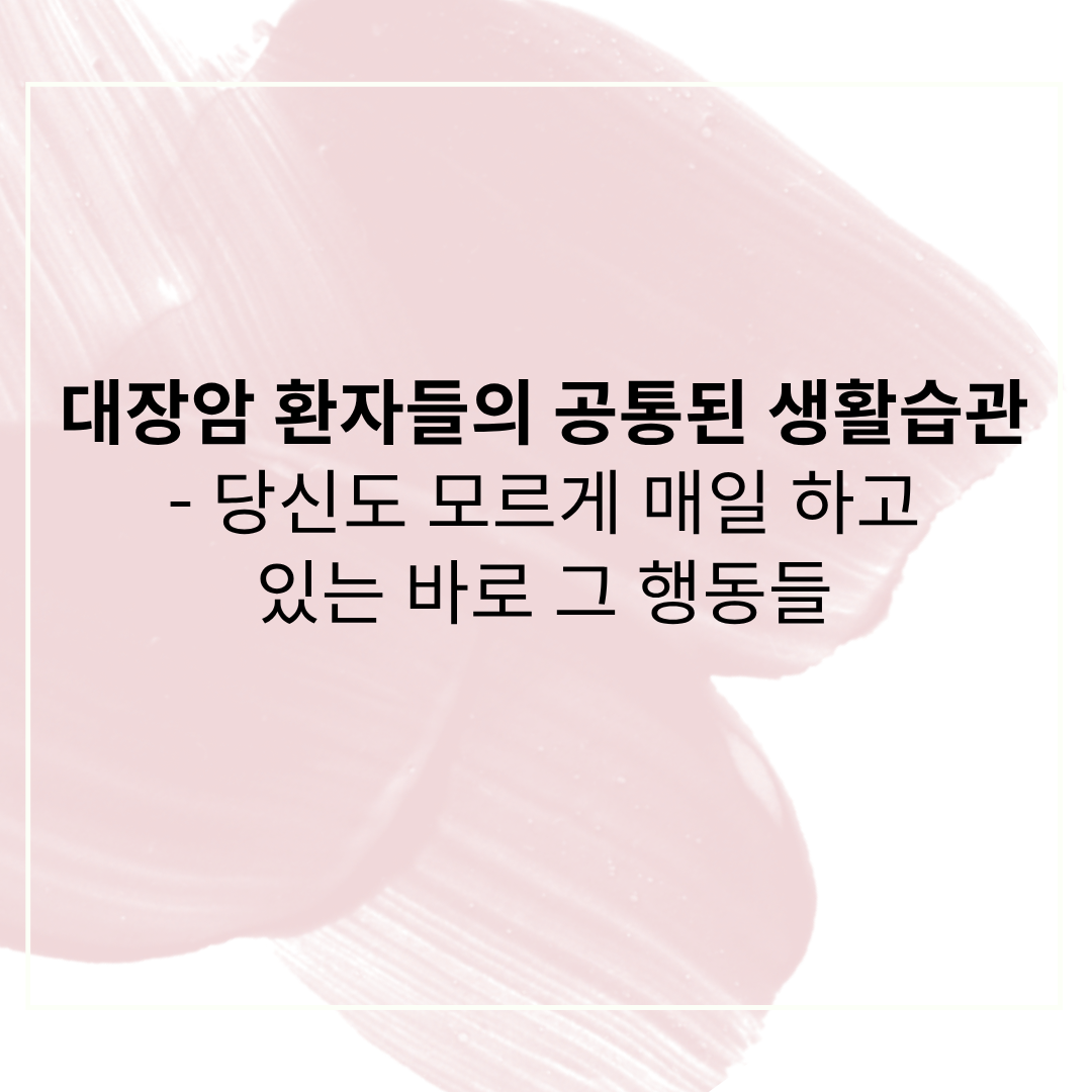 건강할 때는 몰랐던 것들이 병을 마주하면 보이기 시작합니다. 특히 대장암 환자들은 진단 이후 스스로의 생활습관을 돌아보며 한 가지씩 같은 이야기를 꺼냅니다. 무심코 지나친 일상이 병의 씨앗이 되었음을 뒤늦게 깨닫는 거죠.