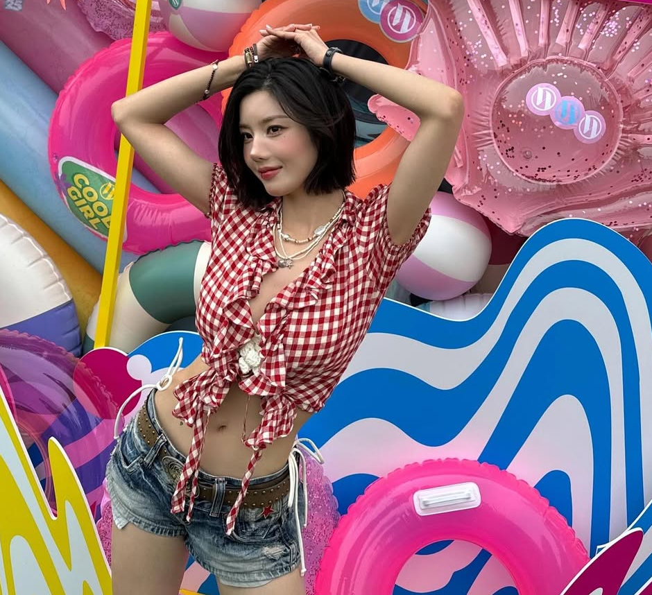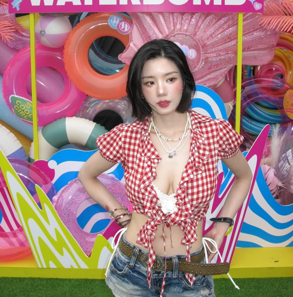 권은비 님은 레이스가 달린 빨간 체크 크롭 블라우스를 착용하여, 섹시하면서도 귀여운 느낌을 동시에 연출했어요. 레이스 디테일로 여성스러움을 한층 강조하며, 그녀의 탄탄한 보디라인을 자연스럽게 돋보이게 했죠.
