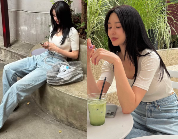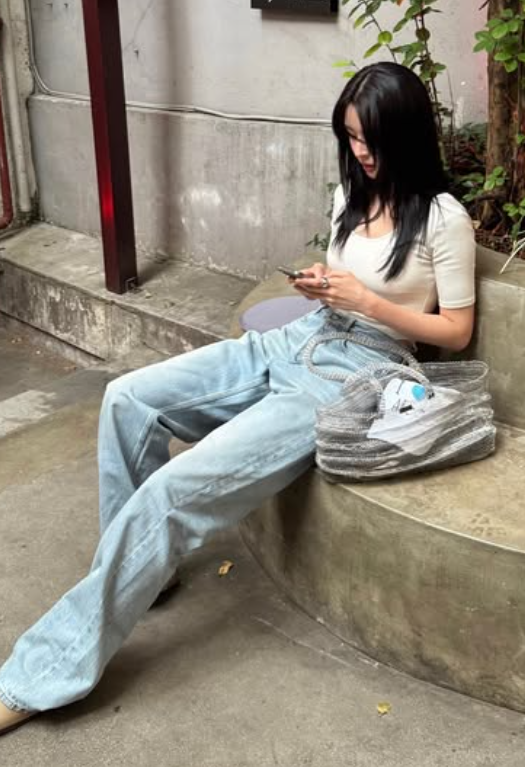 가방은 트렌디한 투명 핸드백을 들었는데요. 미니멀한 데일리룩에 은은한 포인트를 주기에 딱 좋은 아이템이었어요. 내부 소지품이 살짝 비치는 투명백은 여름 시즌의 시원한 무드와도 잘 어우러지며, 심플한 스타일에 경쾌한 분위기를 더해줬답니다.