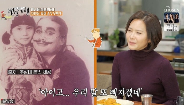 2022년 TV조선 '식객 허영만의 백반기행'(이하 '백반기행') 142회에서는 배우 겸 영화감독 추상미와 함께하는 대구 동구 팔공산 밥상기행이 그려졌습니다. 이날 허영만은 추상미의 얼굴을 뚫어져라 보더니 "가만 보니 아버님 얼굴이 사각형이었는데 그 기운이 남아있다"라고 말하며 추상미의 아버지, 연극계의 거장 故추송웅을 떠올렸습니다.