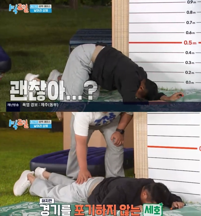 평상 취침이 확정되자 조세호는 “에이씨!”라며 뒤에 있던 박스를 향해 분노의 뒤돌려차기를 날렸다. 제작진이 “거기 탈의실인데…”라고 말하자, 조세호는 “뭐하는거야 이 시간에 안자고! 그만 찍어 뭘 찍어 하루종일! 뭘 야생이야 야생은!”이라며 장난스럽게 소리쳤다. 이 모습을 본 문세윤은 “뒤돌려차기는 처음 본다”며 폭소했고, 조세호는 이내 “진심으로 사과드린다. 너무 흥분했다. 시청자 여러분 죄송하다”고 고개를 숙였다.