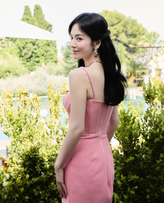 송혜교 님이 선택한 드레스는 부드럽게 몸매를 감싸며 아래로 갈수록 자연스럽게 퍼지는 머메이드 디자인이었어요. 특히 톤다운된 핑크 컬러는 그녀의 맑고 투명한 피부 톤과 완벽하게 어우러지며 고급스럽고 로맨틱한 무드를 자아냈죠.
