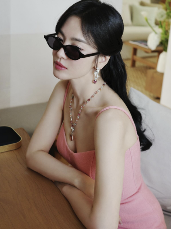 이번 룩에서 또 하나의 포인트는 바로 레드 컬러가 빛나는 화려한 주얼리 목걸이! 핑크와 레드의 조합은 자칫 튈 수 있는 컬러 매치지만, 송혜교 님은 이를 세련되게 소화해냈어요. 목선을 따라 반짝이는 주얼리가 전체 룩에 화려한 포인트를 더해주며, 여성스러움과 고급스러움을 동시에 강조했답니다.