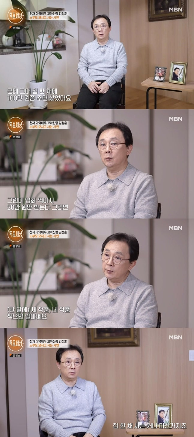 김정훈은 20여 년의 공백기를 깨고 외국에 있는 가족들과 떨어져 노부모를 모시고 살고 있는 근황을 공개했습니다. 김정훈은 데뷔시절 인기에 대해 “한 달에 대본이 들어오면 거의 한 열 작품씩 들어온다. 오늘은 이 영화 내일은 저 영화, 한꺼번에 찍는 거다. 근데 그때 집 한 채에 100만 원 정도 했다. 출연료 20만 원 받아서 세 작품 네 작품 찍으면 집 한 채를 살 수 있었다”라고 당시 뜨거운 인기를 언급했습니다.