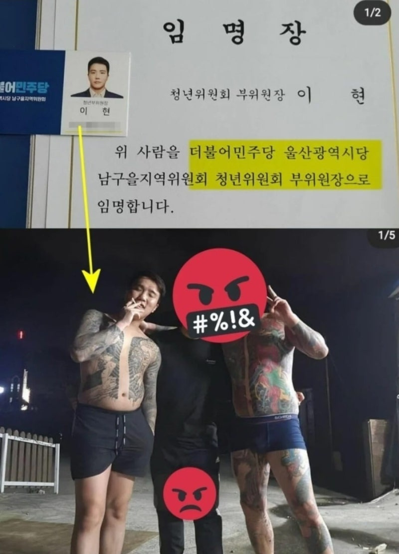 최근 온라인 커뮤니티를 중심으로 빠르게 확산된 한 장의 사진이 논란의 중심에 섰습니다. 사진 속 인물은 더불어민주당 울산광역시당 청년위원회 부위원장으로 임명된 이현 씨로, 상반신 전체에 문신을 새긴 모습이 포착되었습니다. 이 모습은 마치 조직폭력배를 연상시킨다는 비판과 함께, 민주당 청년 조직의 도덕성과 이미지를 실추시켰다는 평가를 받고 있습니다.