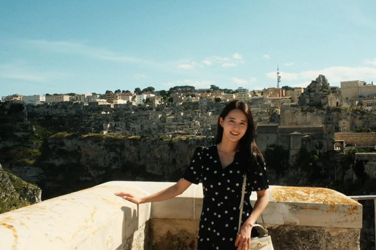 도트 원피스와 아이보리백으로 완성한 클래식 썸머룩