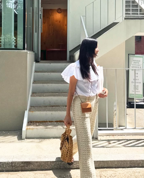 볼륨 블라우스와 크로셰 팬츠, 휴양지 무드 가득한 데일리룩 포착