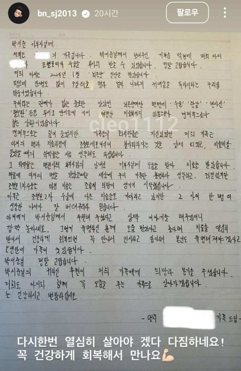 조혈모세포 이식 수술은 막대한 치료비 부담을 안게 됩니다. 이러한 상황 속에서 박서준 씨의 후원은 아이와 가족에게 한 줄기 희망이 되었습니다. 박서준 씨의 도움 덕분에 아이는 무사히 이식 수술을 마칠 수 있었고, 가족들은 감사의 마음을 담아 손편지를 작성, 박서준 씨에게 전달했습니다.