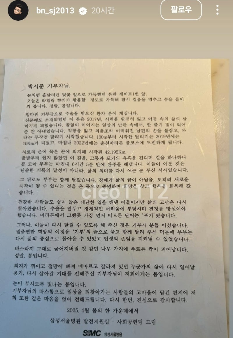 삼성서울병원 사회공헌팀 역시 박서준 씨에게 진심으로 감사를 표하는 편지를 전달하며 훈훈함을 더했습니다. 기부자 박서준 씨, 이를 연결한 사회공헌팀, 그리고 희망을 얻은 환아 가족 모두에게 따뜻한 응원을 보내고 싶습니다.