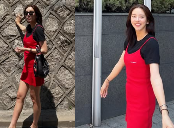 스타일 아이콘 손담비 님이 이번엔 한층 더 센스 있는 레이어드 룩으로 시선을 사로잡았어요. 강렬한 레드 미니 원피스에 시크한 블랙 아이템들을 조합한 스타일링은, 단순하지만 감각적인 매력으로 무장한 룩이었답니다.