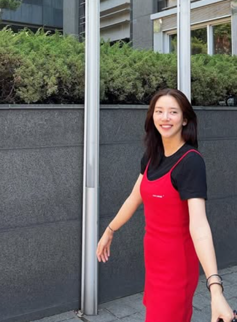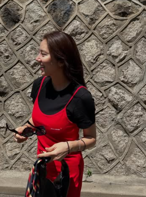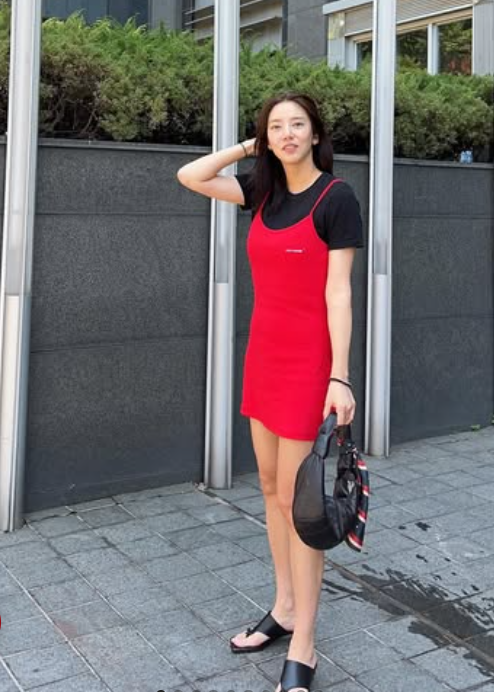 손담비 님의 룩에서 가장 눈에 띄는 건 단연 강렬한 레드 컬러의 미니 원피스였어요. 미니멀한 디자인의 나시 원피스는 과하지 않으면서도 컬러만으로 포인트를 줄 수 있는 아이템이었죠. 특히 여름철엔 이런 비비드한 컬러가 피부톤을 밝혀주며, 경쾌하고 생기 넘치는 분위기를 더해주었어요.