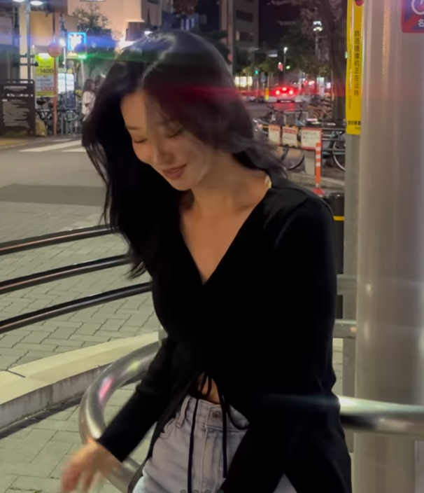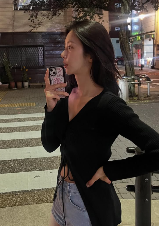 이주빈 님이 착용한 상의는 군더더기 없이 타이트한 핏의 블랙 니트 탑이었어요. 눈에 띄는 포인트는 바로 허리 스트링 디테일! 은근하게 허리를 감싸는 스트링은 시선을 허리선으로 자연스럽게 유도하며 슬림한 바디라인을 강조했죠.
