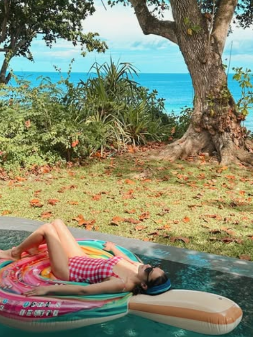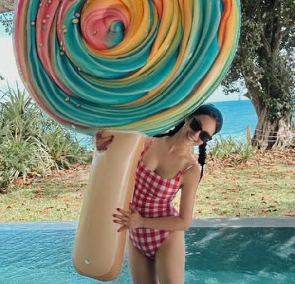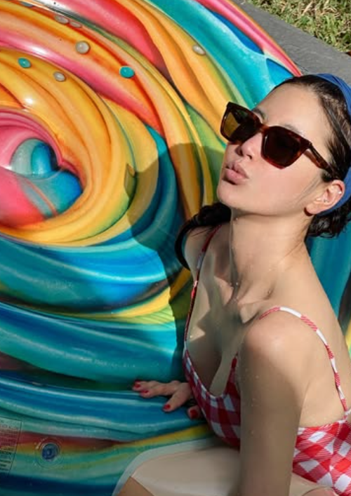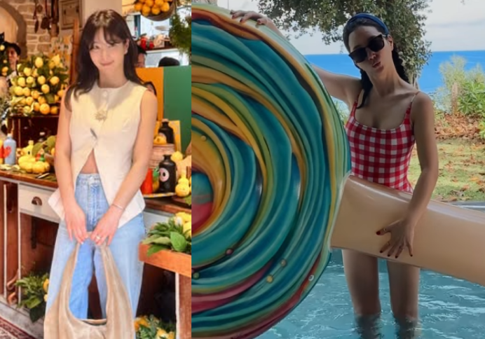 기은세 님의 이번 수영복 룩은 레트로한 매력과 발랄한 분위기가 어우러진 스타일이었어요. 체크 패턴과 스타일리시한 액세서리로 여름철을 더욱 돋보이게 만든 패션이었습니다.