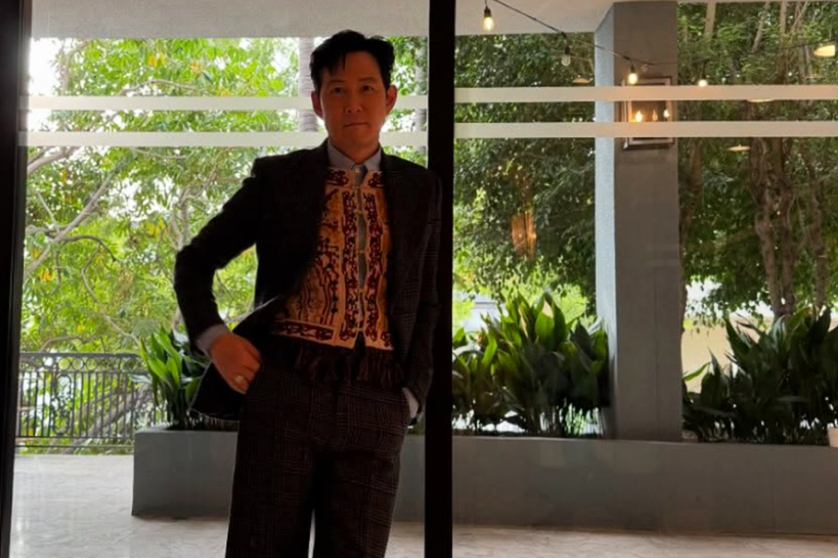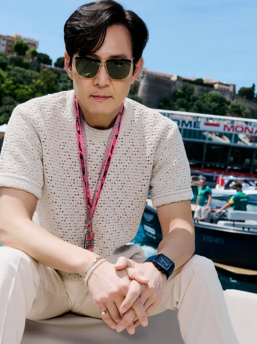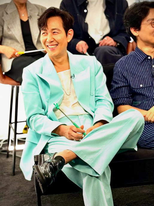이정재는 아이보리 톤의 짧은 소매 니트에 같은 계열의 팬츠를 매치하며, 군더더기 없는 미니멀 스타일을 완성했다.