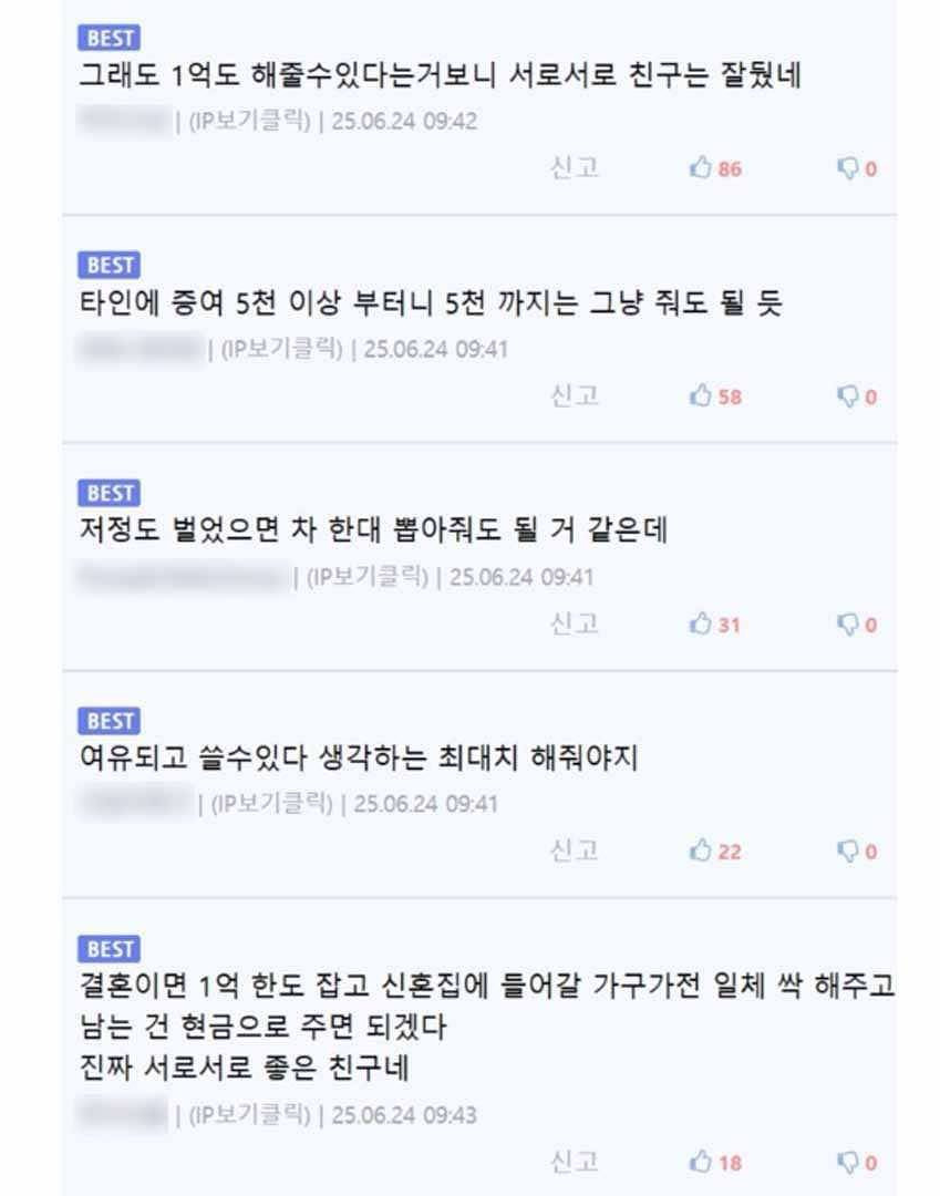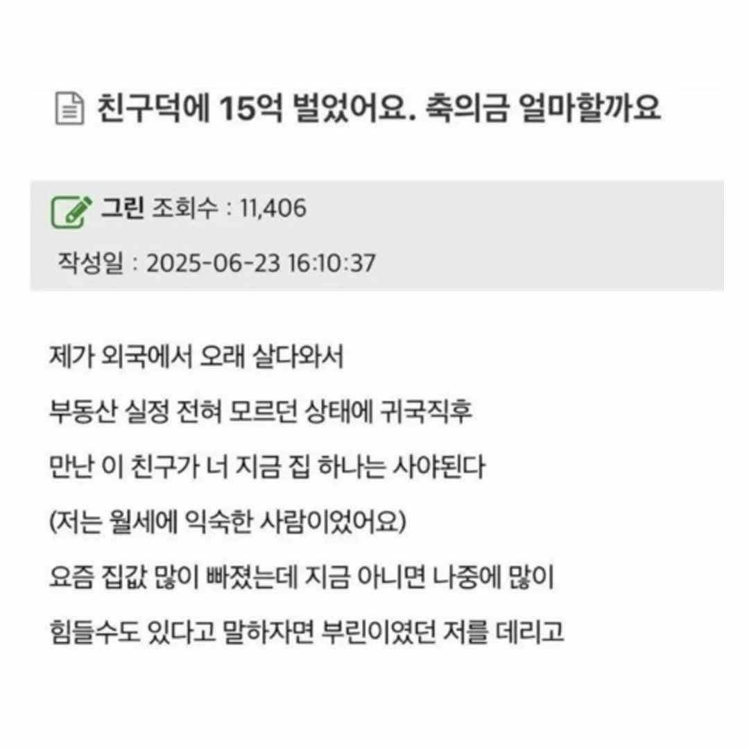 친구덕에 15억 벌었어요 축의금 얼마할까요?