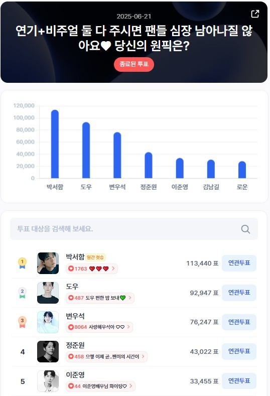 2025년 6월 디시트렌드에서 진행된 '영화·드라마 남자 배우' 부문 일간 투표 결과, 박서함이 113,440표로 1위를 차지하며 팬들의 뜨거운 지지를 받았습니다. 2위는 도우, 3위는 변우석이 76,247표로 뒤를 이었습니다. 이어 정준원(43,022표), 이준영(33,455표), 김남길(30,604표), 로운(28,073표)도 상위권에 이름을 올리며 드라마와 영화 팬들의 열렬한 지지를 입증했습니다.