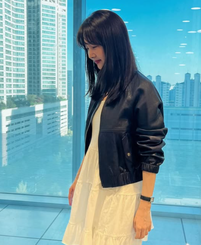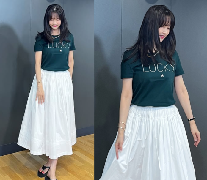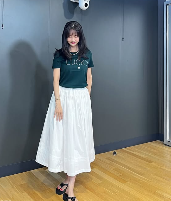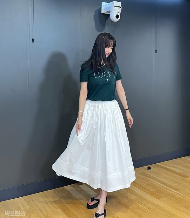 그녀의 일상 패션도 청순하면서도 단정함이 느껴졌어요. 상의는 핏되게 붙는 디자인으로 날씬한 실루엣을 강조했고, 반팔임에도 컬러감 덕분에 차분하면서도 생기 있는 분위기를 연출했어요. 하의로 매치한 화이트 롱스커트는 넓게 퍼지는 플레어 라인으로 여성스럽고 우아한 무드를 더했죠. 여기에 신발은 쪼리 형태의 슬리퍼를 신어 편안하면서도 센스 있는 마무리를 해줬답니다.