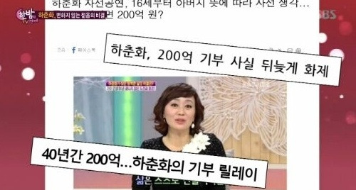 그녀는 자신이 얼마나 기부했는지 정확히 기억하지 못한다고 했습니다. 그것은 어쩌면 기록하려고 한 것이 아니라 그냥 습관처럼 해온 일이기 때문일 것입니다. 그냥 자신이 할 수 있는 만큼 할 수 있는 곳에 손을 내미는 것, 그것이 하춘화 선생님의 삶이고 철학일 것입니다.