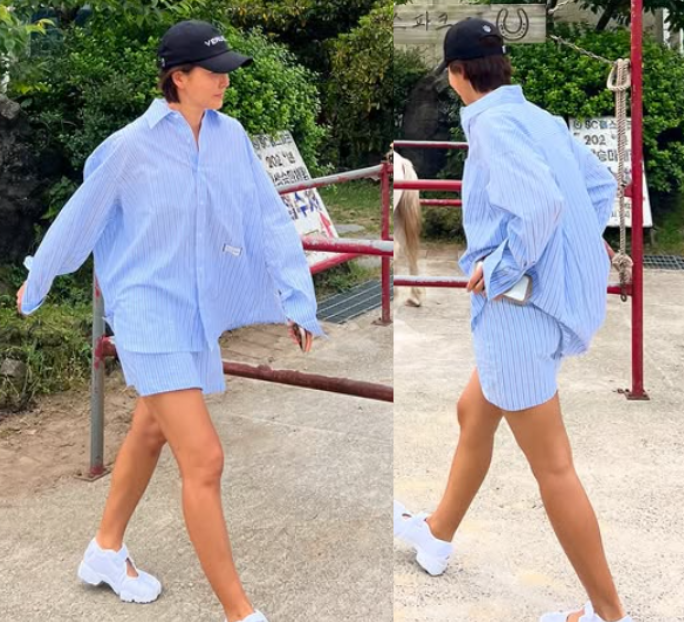 하의는 동일한 줄무늬 패턴이 적용된 반바지로, 전체적인 룩에 통일감을 주었어요. 반바지 길이는 여름에 적합한 길이로, 활동적이고 편안한 느낌을 주었죠.
