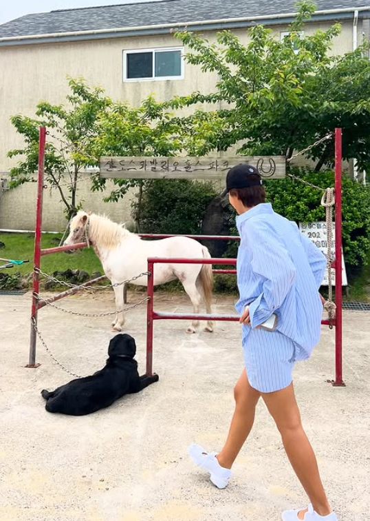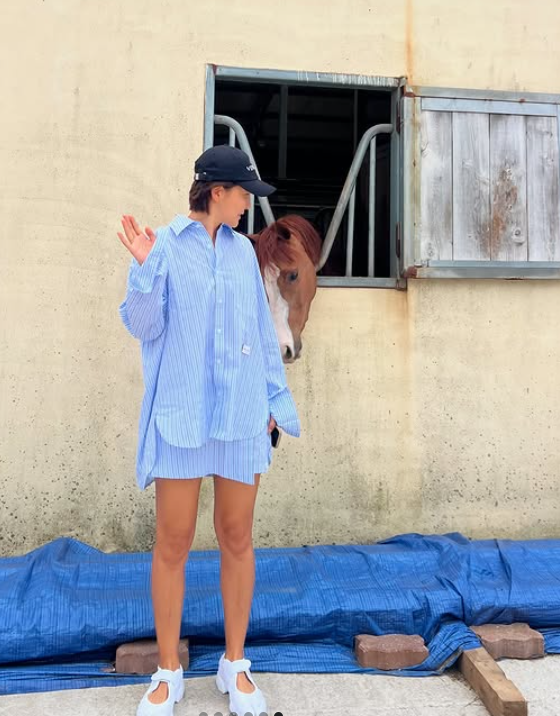 진서연 님의 이번 룩은 청량하고 캐주얼한 매력이 돋보이는 스타일이었어요. 스트라이프 패턴의 셋업을 중심으로, 여름에 어울리는 시원한 분위기를 강조한 패션이었습니다.
