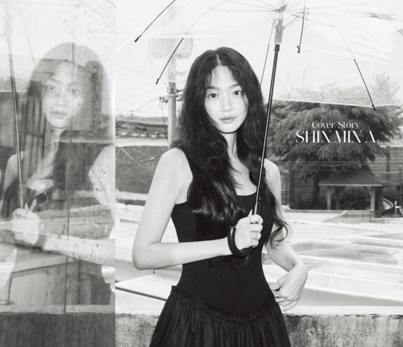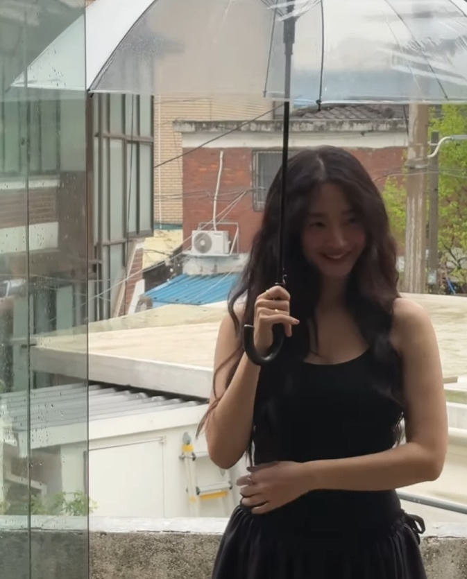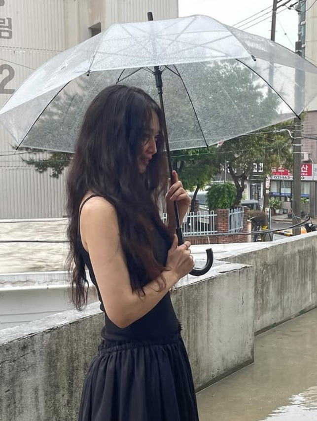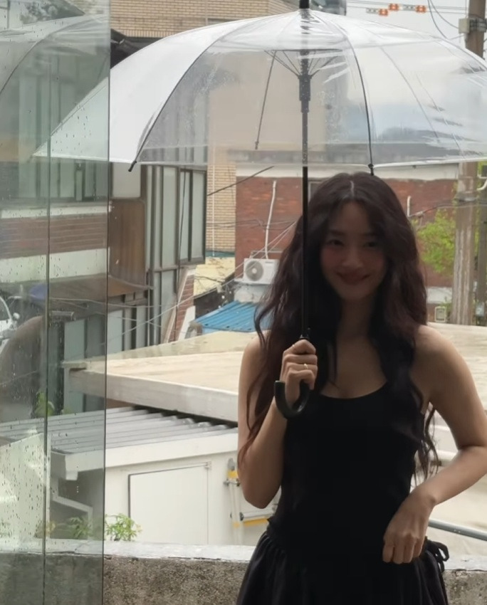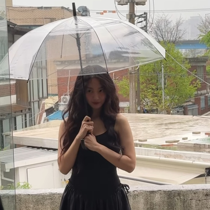 투명 우산은 비 오는 날의 낭만적인 감성을 더하는 포인트 아이템입니다. 신민아 님의 패션 센스가 돋보이는 부분이죠.