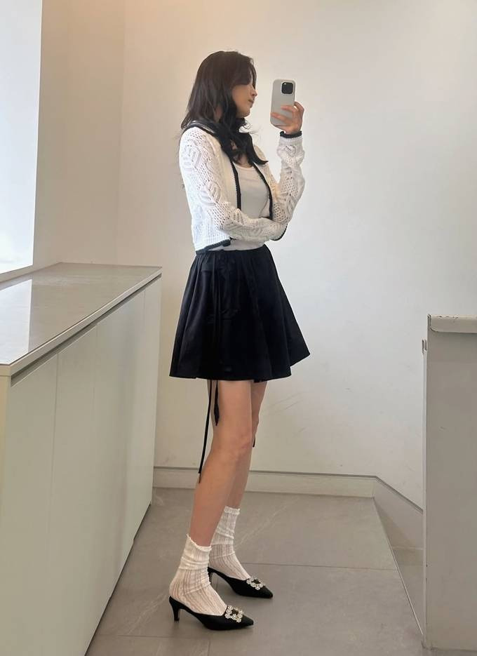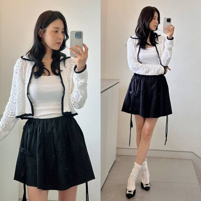 공개된 사진 속에서 한지혜는 흰색 민소매 슬림 탑 위에 짜임이 돋보이는 크롭 니트 카디건을 걸쳐 여성미를 살렸고, 허리 라인을 강조하는 블랙 미니 플레어 스커트로 청순함에 경쾌한 매력을 더했습니다. 마치 20대 못지않은 맑고 깨끗한 이미지가 그대로 느껴지는데요. 특히 하트 하나로 모든 설명을 대신한 그녀의 자신감 넘치는 표정이 더욱 빛나 보였습니다.