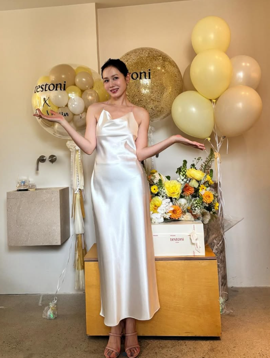 실크 소재가 주는 광택 덕분에 더욱 고급스러우면서도 럭셔리한 느낌이 뚜렷하게 살아났죠. 이 원피스는 단순한 디자인이지만, 소재와 핏이 그녀의 스타일을 완벽하게 살려주며 특별함을 더했어요.