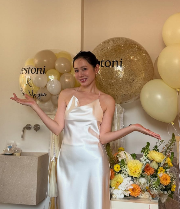 이어지는 화이트 실크 원피스는 끈 나시 스타일로 손예진 님의 예쁜 어깨 라인을 강조하며 우아함을 더했어요.