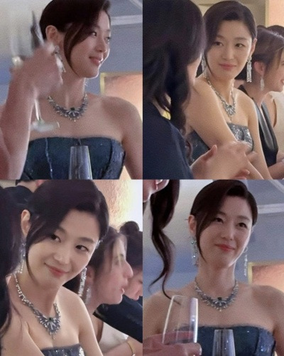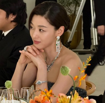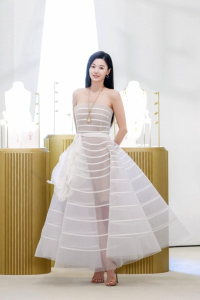 마치 조형물처럼 아름다운 곡선이 돋보이는 화이트 드레스는 전지현 씨의 깨끗한 이미지를 더욱 부각했습니다. 놀랍게도 이 드레스는 최근 결혼한 모델 아이린 씨가 웨딩드레스 후보로 고려했던 제품이라고 합니다. 순수하면서도 우아한 매력이 전지현 씨에게 완벽하게 어울리는 모습입니다.