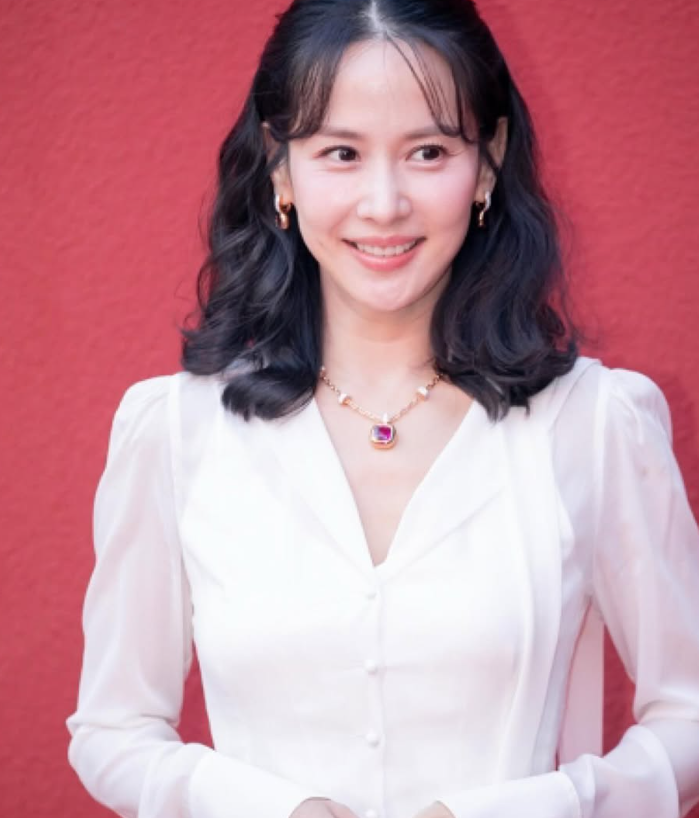 기본에 충실하면서도 우아함이 묻어나는 화이트 블라우스는 조여정 님의 단정하고 기품 있는 분위기를 완성시켜주는 핵심 아이템. 군더더기 없는 라인과 깔끔한 디테일이 고급스러운 느낌을 자아냈습니다.