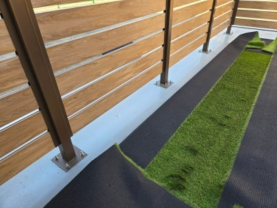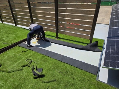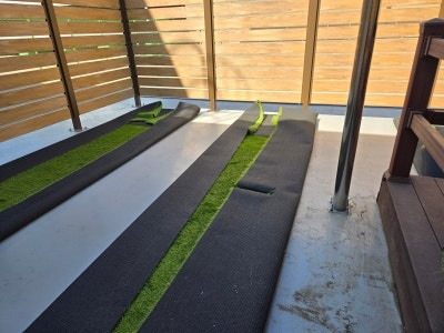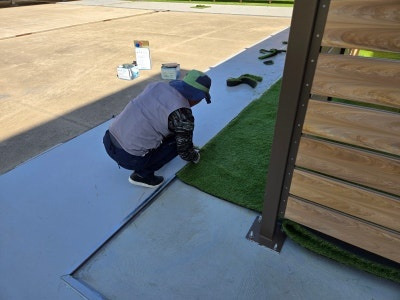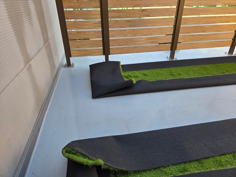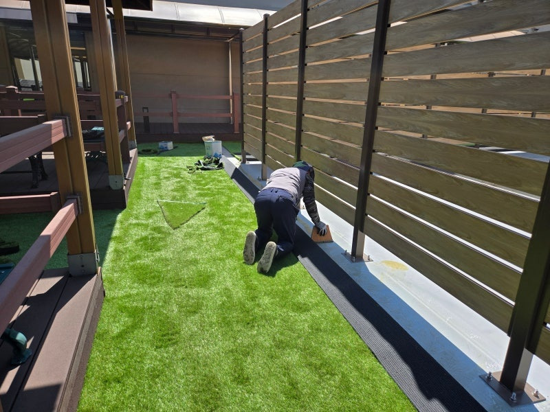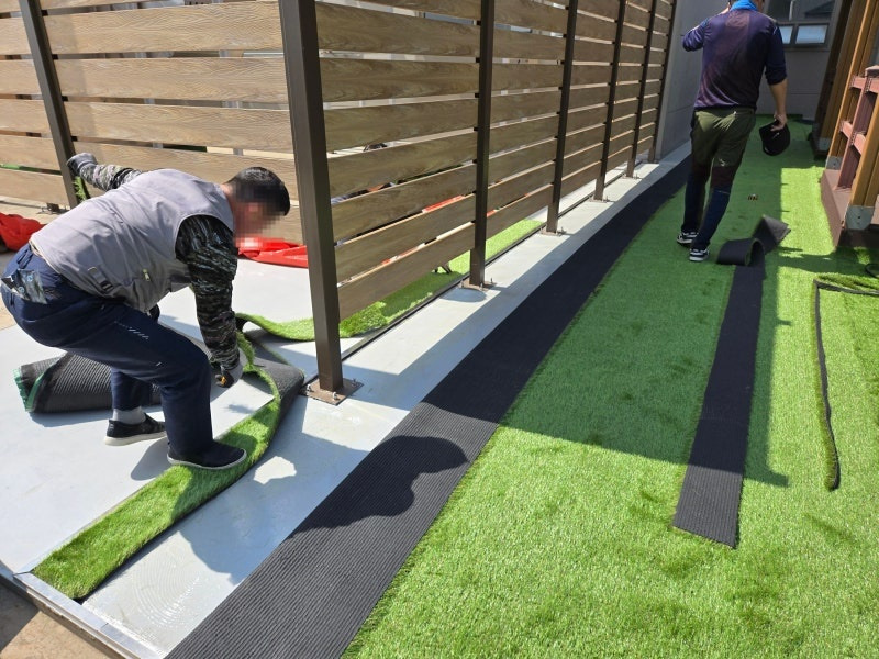 이제부터는 섬세한 작업이 필요합니다. 잔디를 바닥 모양과 구조물에 맞춰 꼼꼼하게 재단해야 하죠. 특히 기둥 주변이나 모서리 부분은 더욱 신경 써서 작업해야 깔끔한 결과물을 얻을 수 있습니다.