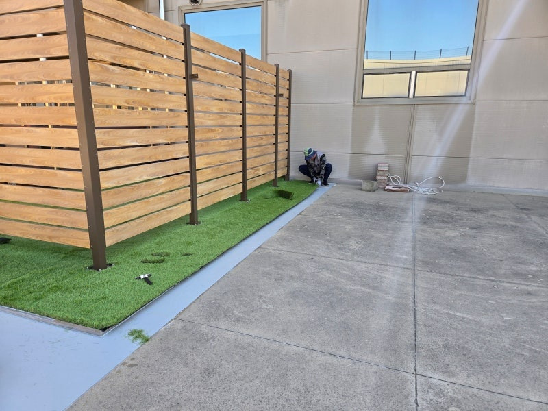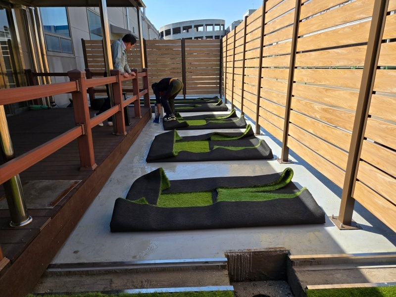 구조물에 맞춰 마무리까지 꼼꼼하게 재단하고 설치하면… 짜잔! 드디어 옥상 변신 완료!