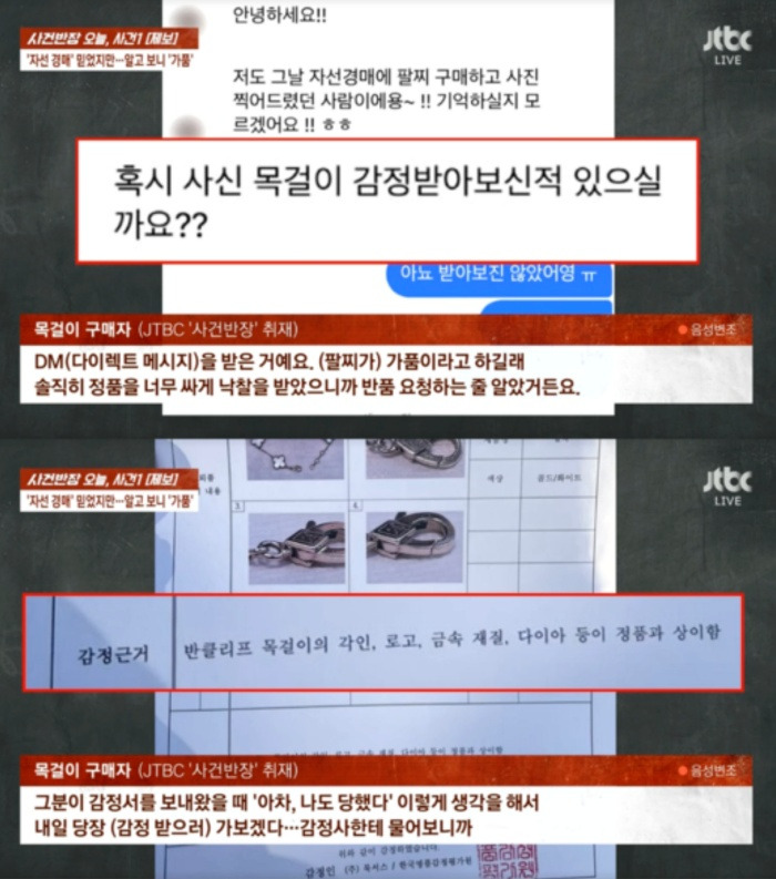 약 한 달 뒤, 같은 행사에서 동일 브랜드 팔찌를 140만 원에 구매한 C씨로부터 ‘팔찌가 가짜였다’는 DM을 받게 됩니다. A씨 역시 자신이 구매한 목걸이를 감정한 결과, 가품으로 판정받았다고 합니다. 감정 결과, 목걸이는 18K 금으로 제작되었으나 브랜드 정품이 아닌 일반 귀금속으로 밝혀졌습니다. 목걸이 감정가는 약 100만 원, 팔찌 감정가는 약 70만 원으로, 실제 가치보다 훨씬 비싸게 판매된 셈입니다.