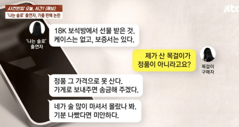 A씨가 B씨에게 제품 케이스나 보증서를 요구하자, 처음에는 “목걸이는 금은방에서 샀고 케이스는 없지만 보증서는 있다”고 해명했습니다. 하지만 이후 태도를 바꿔 “정품은 그 가격으로 못 산다. 물건 돌려주면 환불해 주겠다”고 말했고, 심지어 “(자선 행사 때) 진짜라고 말한 적 없다”, “돈 부쳐주면 되는데 뭐가 문제냐”는 발언까지 했다고 합니다. 이에 A씨는 분노를 금치 못했습니다.