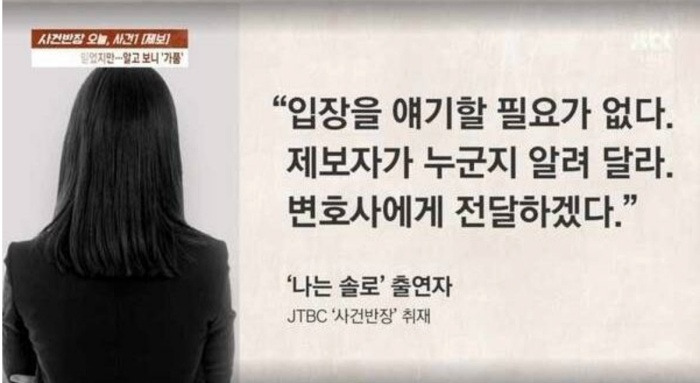 ‘사건반장’ 측이 B씨에게 의혹에 대한 입장을 묻자, B씨는 “입장을 밝힐 필요가 없다”며 “제보자가 누구인지 알려 달라. 변호사에게 전달하겠다”는 답변만 남겼습니다. 구체적인 해명은 전혀 없었습니다.