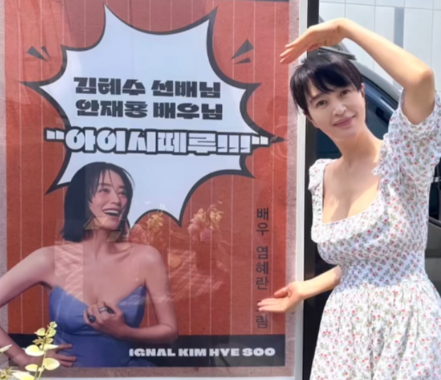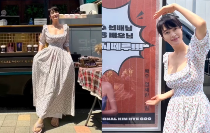 신발은 베이지 쪼리를 매치하여 전체적인 룩에 자연스러운 마무리를 더했어요. 쪼리는 편안하면서도 여름에 잘 어울리는 아이템으로, 김혜수 님의 여성스러운 분위기와 잘 어우러졌죠.