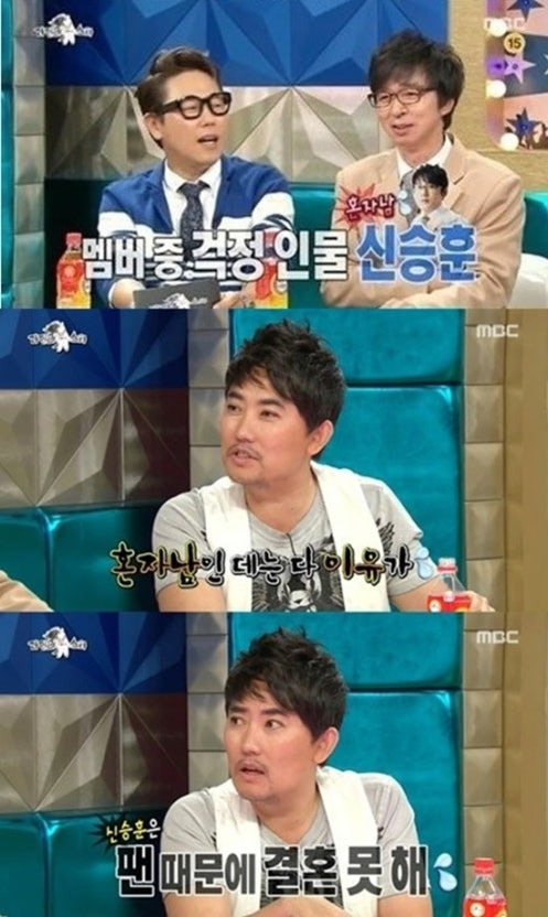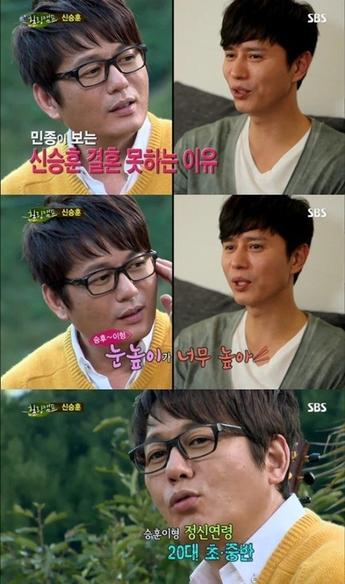 SBS '힐링캠프'에서 신승훈은 스스로 가요계 대표 노총각이 된 까닭에 대해 "고쳐야 될 것이 많다"라고 밝혔습니다. 그런가 하면 신승훈의 절친으로 이날 깜짝 출연한 김민종은 “신승훈은 눈높이가 너무 높다”며 “정신연령이 나와 비슷하게 20대 초반에 멈춰있다”라고 말해 당황케 했습니다.