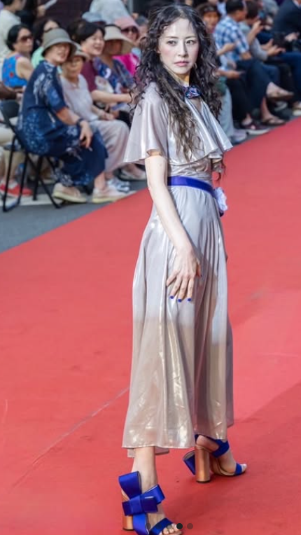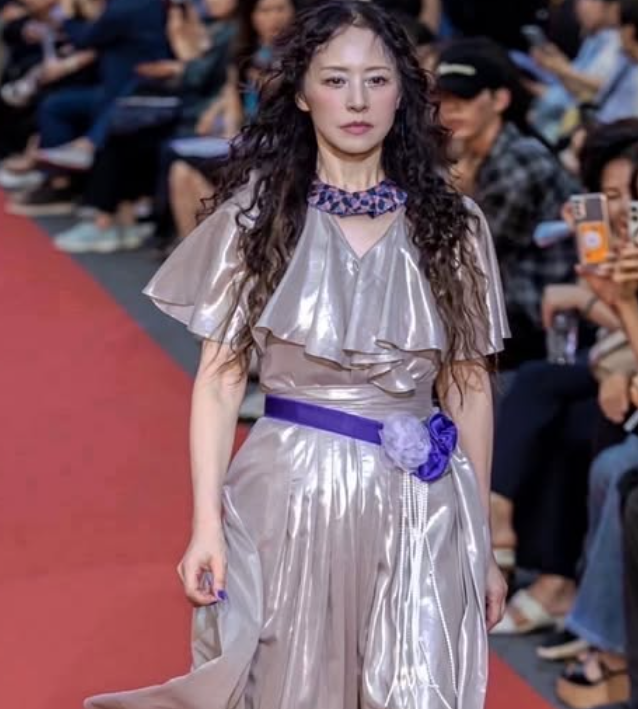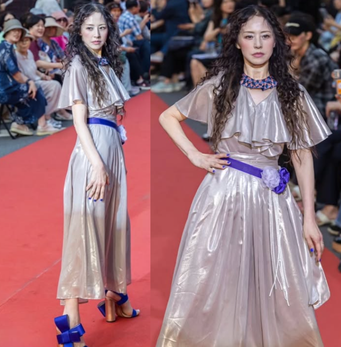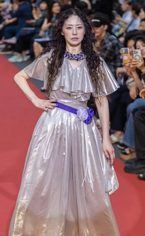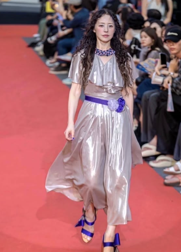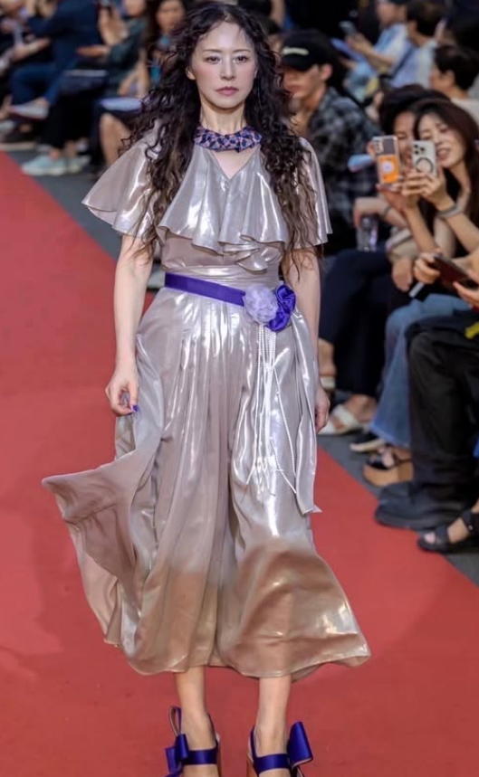 서정희 님의 런웨이 패션은 62세라는 나이를 전혀 느낄 수 없을 만큼 세련되고 감각적이었어요. 은빛 새틴 드레스와 퍼플 벨트, 보랏빛 코사지와 파란 리본 힐의 조합은 그 자체로 강렬하면서도 우아한 균형을 이루었고, 그녀의 세심한 스타일링이 빛을 발했어요.
