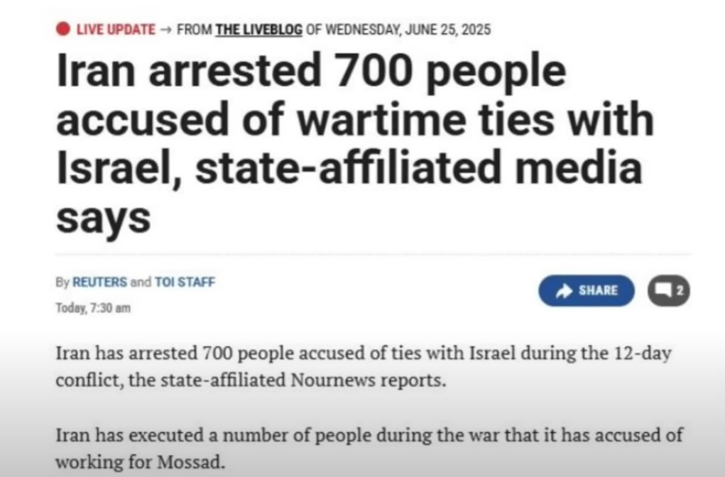 하지만, 이란 내부에서는 이스라엘 정보기관과 접촉한 혐의로 최소 700명이 체포되는 초유의 사태가 발생했습니다.
