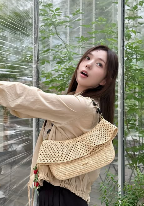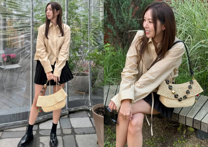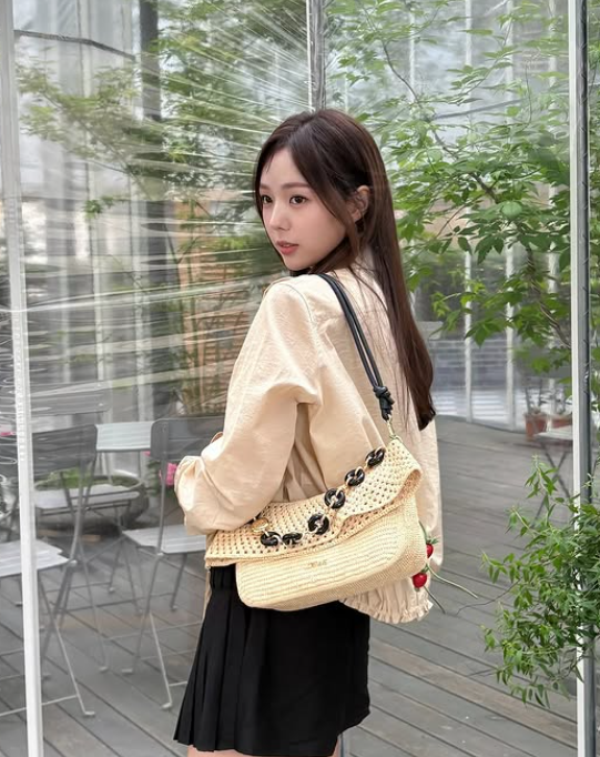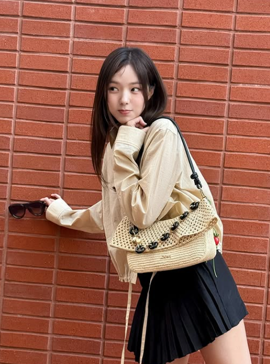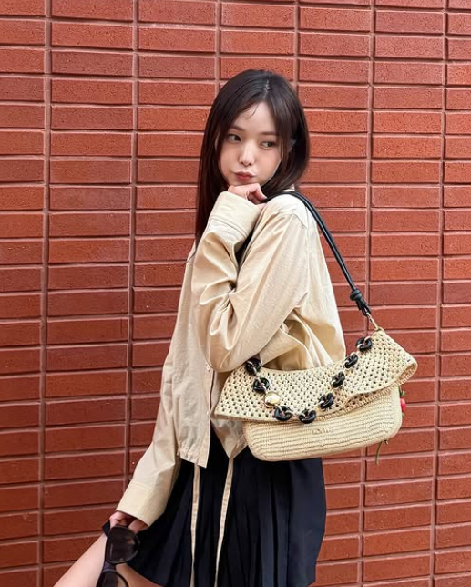가방은 여름 느낌이 나는 구멍이 숭숭 뚫린 베이지 핸드백을 선택했어요. 이 가방은 룩에 산뜻하고 가벼운 느낌을 더해주며, 여름철 분위기에 잘 어울렸죠. 구멍이 뚫린 디자인이 트렌디하면서도 실용성을 강조해 주어, 전체 스타일에 멋스러움을 더했습니다.