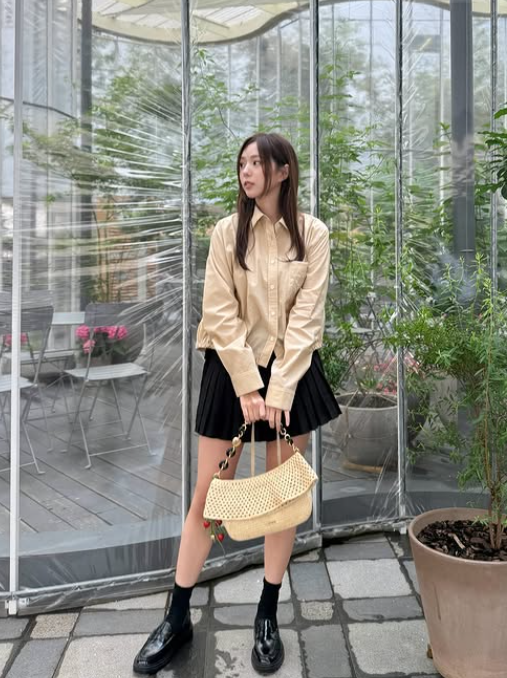 하의는 검정색 플리츠 미니스커트로, 러블리하면서도 세련된 느낌을 주었어요. 미니스커트는 그녀의 다리 라인을 길어 보이게 해주며, 플리츠 디자인이 여유 있는 실루엣을 만들어줘 더욱 사랑스러운 분위기를 자아냈죠.